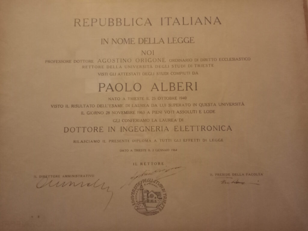 Mi sono laureato il 28 novembre 1963 (110/110 cum laude) ingegnere elettronico presso l’Università di Trieste.
